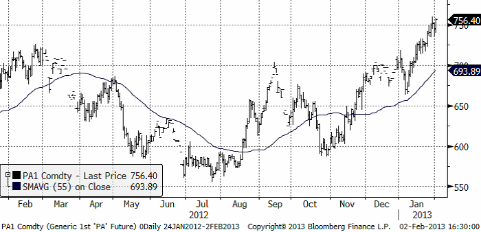 Palladium fortsätter att stiga. Palladium används i katalysatorer för bensindrivna bilar. Pristrenden är som vi ser i kursdiagrammet nedan, stadigt uppåtriktad.
