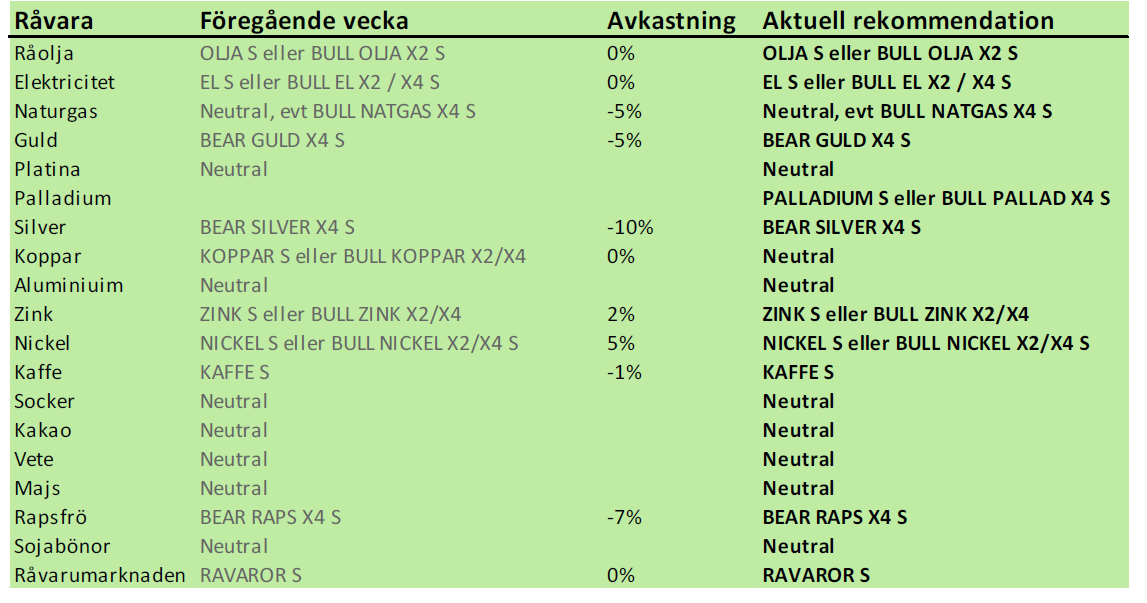 Vi rekommenderar en neutral position i koppar. Om konjunkturscenariot i Kina skulle gå in ett mindre positivt läge (vi bedömer det som mindre sannolikt) är koppar den bästa kandidaten för placering i prisnedgång.