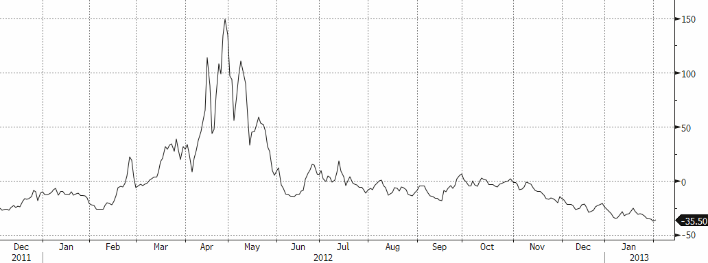 Nästa graf visar skillnaden mellan spot (cash) och 3 månaderspriset (minus betyder att 3 månaderspriset är högre än spot = contango). Som nämndes i ingressen betyder det god tillgång på fysisk vara, vilket således avspeglas i ökande contango. Som vi tidigare nämnt rapporterar producenterna om ett ökat utbud det kommande året. Ökande smältlöner (se förra veckans brev) är också ett tecken på detta.