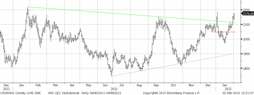 Vi noterar starka uppgångar under veckan som gick. Koppar och aluminium ca 3 %, zink 4,5 och nickel sticker ut med 7 %. Metallerna har brutit ur sina tidigare ”tradingintervall”, vilket har satt igång aktivitet framför allt från finansiella aktörer. Industrin i Europa är emellertid fortsatt avvaktande. Asien är mer aktiva och anses ”boka upp” material före det kinesiska nyåret med förväntningar om ökad efterfrågan längre fram. Aktörerna köper således på förväntningar om ökad efterfrågan. Basen för all handel i basmetaller på Londons metallbörs är 3-månadersnoteringen, och det är ungefär i det perspektivet som den fysiska efterfrågan måste ta fart för att försvara prisuppgången. Rapporter från den fysiska marknaden gör gällande att tillgången är god. Ett tecken på detta är att alla basmetaller har ”Contango”, vilket på råvaruspråk innebär att terminspriset är högre än spot. En viktig tumregel på råvarumarknaden är: contango= gott om material, det motsatta förhållandet, backwardation=ont om material. Slutsatsen av resonemanget är således att den fysiska marknaden måste ”komma ifatt” den finansiella för att prisbilden skall hålla. Det som driver finansmarknaden är de makroekonomiska indikatorerna som onekligen talar för en starkare konjunktur. I fredags kom inköpsindex, som är en av de mer relevanta framåtblickande indikatorerna för basmetallefterfrågan. USA uppvisade en stark siffra på 53,1 i januari mot 50,2 i december. Europa stiger men är fortfarande under 50, medan Sverige ryckte från 44,6 i december till 49,2. Den samlade konjunkturbilden ser stark ut globalt även om ingen tror på någon kraftig uppgång. Måttlig men stabil tillväxt är vad som väntas. När det gäller basmetallpriser finns risken att marknaderna har överreagerat på uppsidan just nu. Rekyler är att vänta. För den som köpt tidigare kan det vara värt att ta hem vinst (se nickel och zink nedan), för den som inte kommit in i marknaden kan eventuella rekyler ge ypperliga köptillfällen i veckorna som kommer. Kina går på helgfirande om en vecka så aktiviteten därifrån lär vara begränsad, vilket också talar för en svagare marknad de kommande två veckorna.