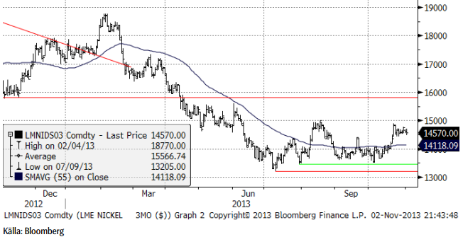 Nickelmarknaden sätter sitt hopp till att Indonesien genomför sitt exportstopp av nickelmalm. Konsultfirman Wood MacKenzie estimerar att 40% av nickelindustrin går med förlust vid dagens priser. Priset passerade marginalkostnaden på uppskattningsvis 17000 dollar per ton under 2012. Det är av den här anledningen som Glencore Xstrata stängde sin Focandogruva i Dominikanska Republiken och det brasilianska bolaget Votoratim stängde sin gruva utanför Fortaleza. Samtidigt expanderar Vale sin produktion med sina nya projekt VNC, Koniambo, Abatovy, Ramu och Ravensthorpe. Alla utom Ravensthorpe är flera år försenade, men kommer nu alltså igång, vilket är oturligt med tanke på priset. De totalt sju projekt som nu successivt kommer igång tillför 275,000 ton nickel till marknaden per år med fullt genomslag 2017 – 2018. Det ska jämföras med överskottet i marknaden under 2008 – 2012 som uppgick till 319,000 ton.