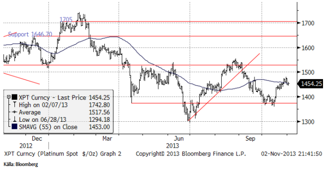 Tekniskt har priset som ovan nämnt vänt ner efter motståndet vid 1350 dollar. Sedan slutet av juni har den fallande trenden övergått i en konsolideringsfas. I det här läget går inte att säga om denna kommer att följas av en fortsättning på prisfallet eller om trenden kommer att vändas uppåt.