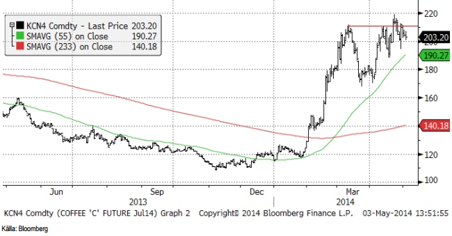 Vi rekommenderar köp av KAFFE S, men man bör ta stoppen om kaffepriset går under 200 cent.