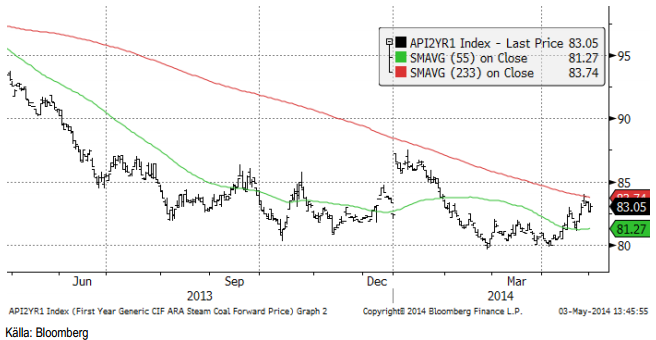 Priset på kol har rört sig uppåt, men utan större dynamik i rörelsen, varför man kan förvänta sig en rekyl nedåt.