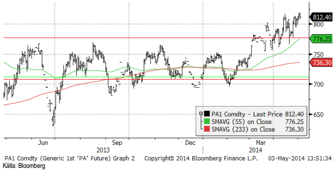 Priset på palladium har också fortsatt att sega sig uppåt. Arbetsmarknadsstatistiken från USA i fredags var oväntat positiv. Fler personer i sysselsättning innebär sannolikt fler bilar och därmed mer palladium i katalysatorer, totalt sett.