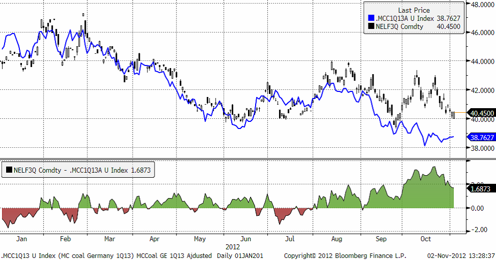 Situationen sedan förra veckan är i stort oförändrad. Det totala hydrologiska överskottet är 10-13 TWh över normalt samtidigt som kärnkraften har god tillgänglighet. Vi har därför länge argumenterat för att differensen mellan NELF3Q och vårt MCCP-index (.MCC1Q13) varit alltför stor. Nu har så en korrigering skett och differensen minskat en del. Q1-2013-kontraktet (NELF3Q) har, i takt med lägre marginalkostnad för kolkraft och fortsatt nederbördsrikt väder, pressats lägre och är senast omsatt på €40,50/MWh. Kontraktet har ändå lite ytterligare fallhöjd och ska, i rådande miljö, närma sig €39/MWh nivån innan vi tycker att kontraktet är köpvärt.