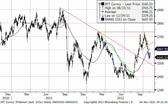 Platina föll ungefär som guldet, dock något mindre strax under 2 %. Situationen i Sydafrika är lugnare, men problemen kvarstår och gruvorna har svårt med lönsamheten. Det allmänna stämningsläget kring både bas- och ädelmetaller är dock inte det bästa just nu. Vi rekommenderar att man försöker komma in på den långa sidan i platina. Risken är dock påtaglig att priset faller ner till 1500 dollar per uns. Det tror vi i så fall är ett bra pris att köpa på.