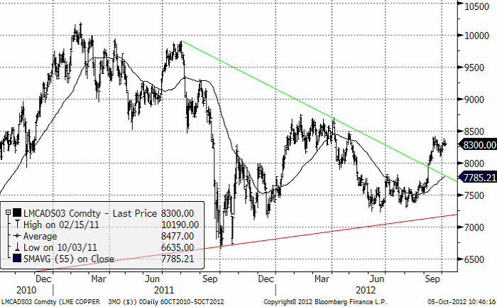 Priset på LME har gjort vissa försök i veckan med en högsta notering på $8380 ( $3,80/Lbs). Men återigen finns inte riktigt kraften. De finansiella aktörerna har redan positionerat sig för uppgång. För nya lyft behöver de fylla på, alternativt att industrin börjar ta en mer framsynt vy och täcker in framtida konsumtion. Kanske avvaktas LME-veckan, då världens metallfolk traditionsenligt samlas i London, i mitten av oktober. Nedan ser vi ett diagram över priset på tremånadersterminen på LME.