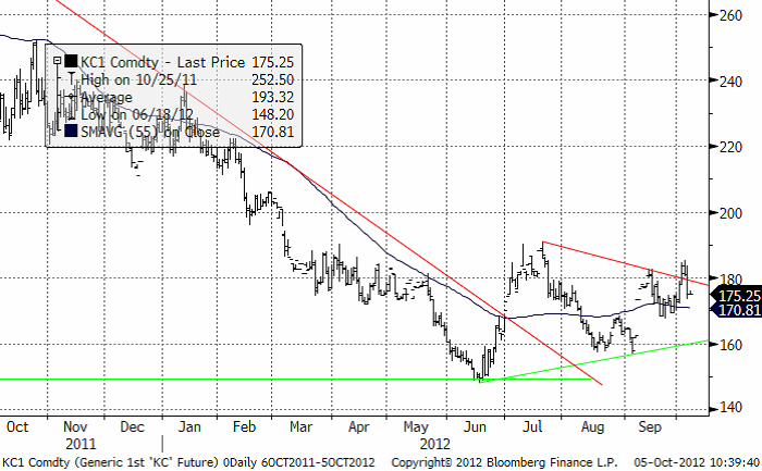 Kaffepriset har fallit tillbaka ner i konsoliderings-zonen. Vi fortsätter att vara neutrala till något positiva till kaffepriset.