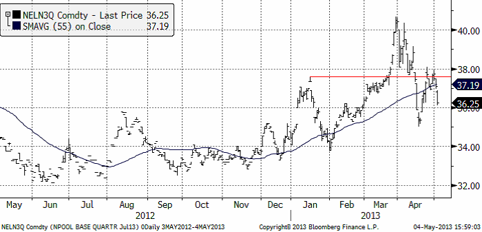 Vi skrev i förra veckan att prissättningen av derivat indikerade en ökad volatilitet. Det fick vi se med besked under den gångna veckan. Delvis kan det ”skyllas” på tunna marknader p.g.a. ledigheterna kring 1:a maj. Kina hade stängt både måndag och tisdag, och stora delar av Europa under onsdagen (UK däremot öppet och därmed LME). Svagheten från fredagen följdes upp med säljtryck ända fram till torsdagen. Nyhetsmässigt var det främst rundan av inköpsindexsiffror som drev marknaderna. Både Kina och USA:s PMI backade mer än väntat, och ligger nu i båda fallen bara strax över 50-strecket. Marknaden har de senaste veckorna främst oroats för att återhämtningen i USA tappat fart. Effekten av fredagens överraskande positiva arbetsmarknadssiffra blev därför dramatisk. Priserna var redan mycket nedpressade. Fredagen bjöd på kraftiga uppgångar mellan 3 och 5 %. Sett över hela veckan ser det mindre dramatiskt ut, med marginella uppgångar. Undantaget är koppar som är upp 3,9 % på veckan.
