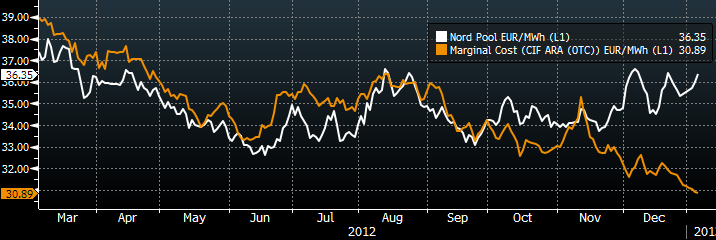 Anledningen till prisuppgången idag är vädret, med mindre nederbörd och kallare temperatur (högtryck). Däremot faller marginalkostnaden för att producera el med kol. Vädret är en kortsiktig faktor, måste man komma ihåg.