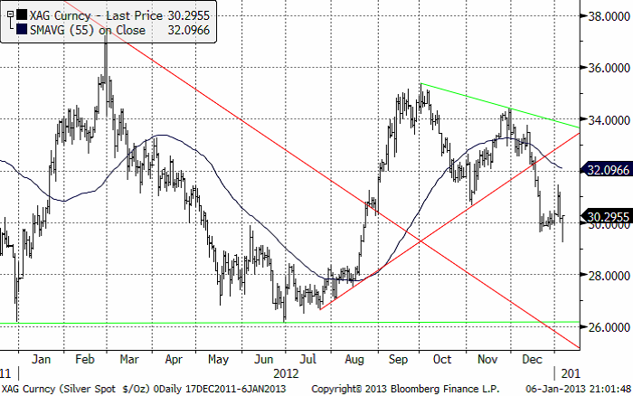 Både guld och silver har med sjunkande toppnoteringar och stigande bottennoteringar sedan början på hösten, bildat så kallade ”triangelformationer”. Dessa bröts i december och sedan följde ganska snabbt fallande priser. Guld är nu som vi ser nere på en teknisk stödnivå vid 1625. Med tanke på att ”Fiscal Cliff” i USA inte är borta från agendan, utan återkommer om två månader, kommer oron sannolikt att finnas kvar för tillståndet i USA:s ekonomi. Det finns delade meningar om vad en ”fiscal cliff” eller politisk uppgörelse om besparingar och skattehöjningar skulle ha för effekt på guldpriset. Men mitt i allt håller FED fortfarande en ränta på nollstrecket och lär så göra bortom överskådlig tid.