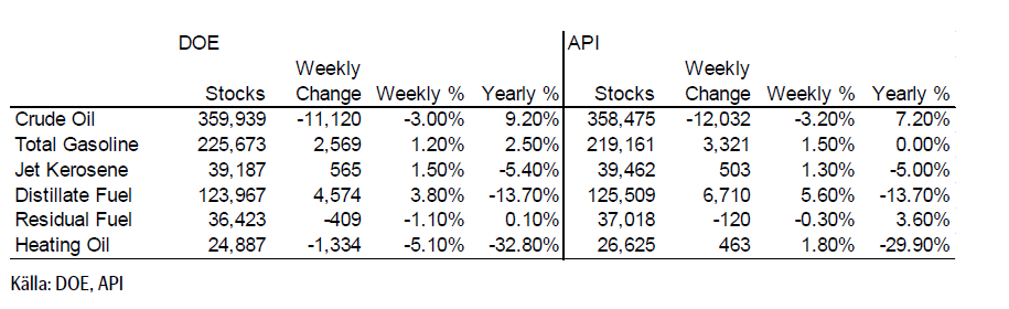 Förra veckans oljelagerstatistik från DOE levererade långt från marknadens förväntan. Råoljelagren minskade mycket kraftigt, hela -11.1 mfat! (förväntat -1.0). Samtidigt ökade produktlagren också, bensin +2.7 och distillates +4.6 mfat. Sammantaget var nettoförändringen således inte jättedramatisk och marknaden tog det också ganska sansat, kanske för att uppgången redan börjat komma av sig.