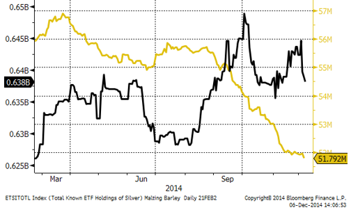 Institutionella investerare har fortsatt att sälja guld igen och nu har de även vräkt ut silver. Antagligen sker en hel del likvidering av generella råvarufonder, till fördel för generella aktiefonder, en process som antagligen fått mer fart i takt med oljeprisets nedgång.