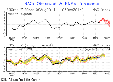 Den Nordatlantiska Oscillationen, där ett NAO som är positivt innebär att varma och fuktiga vindar från sydväst kommer in över Norden, har i en månad medfört väder som präglats av detta. Som vi kan se förutspås denna tendens att fortsätta och vid ungefär den 16 december eventuellt gå över till negativt. Negativt NAO innebär att stillastående ishavskyla kommer ner över Norden, men stjärnklart, vindstilla och knasterkallt väder. Eftersom det både är kallt och vindkraftverken står stilla innebär det högre pris på elektricitet. Det mildra väder vi har nu, kan alltså komma att följas av kallare.