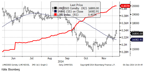 Nickelpriset som rekylerade för en vecka sedan, fann ny styrka i veckan som gick. Vi har i ett år fokuserat på utbudssidan, med Indonesiens exportstopp i fokus. Förra veckan noterade vi att efterfrågan långsiktigt kan få en knäck om det lägre oljepriset dämpar skifferrevolutionen i USA. I Metal Bulletins senaste rapport om rostfritt stål, skriver de (inte förvånande) att en ökning i efterfrågan väntas det kommande kvartalet. Men även fortsättningsvis kommer nog utbudssituationen att fortsätta att vara i marknadens fokus. Den tydligaste indikatorn är LME:s lager. Det kan också vara intressant att studera annullerade lagerbevis (warrants) och hur den volymen utvecklas. Just nu annulleras mest lagerbevis i Malaysia och därifrån går flödet vanligtvis till Kina.