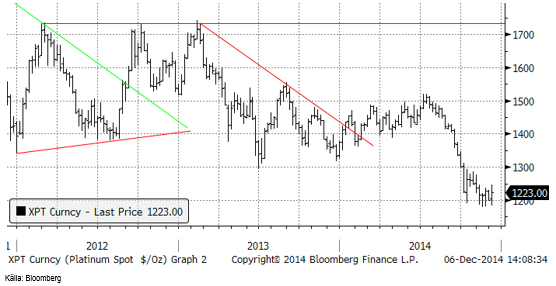 Priset på platina reste sig från 1200 dollar och stängde 23 dollar högre i fredags. Fortfarande är dock marknaden i ”sidledes” konsolidering. Priset skulle behöva gå över 1300 för att man ska våga tro på att vinden har vänt. Tills vidare ser vi dock uppgångar som potentiella säljtillfällen.