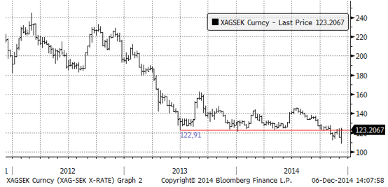 Silverpriset i kronor befinner sig fortfarande i det läge, där metallen enligt den tekniska analysen borde säljas, så länge priset inte går högre, vilket skulle förändra den tekniska bilden av marknaden.