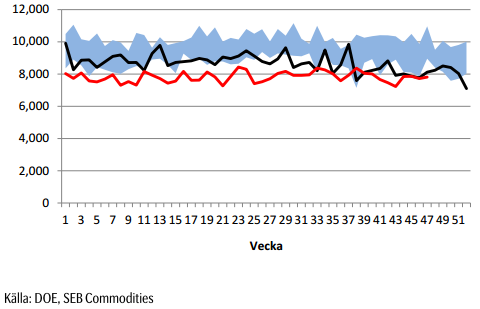 I onsdagens DOE-rapport föll råoljelagren för första gången på tre månader pga säsongen. Justerar man för den säsongsmässiga effekten ligger lagren väsentligt över det ”normala”.