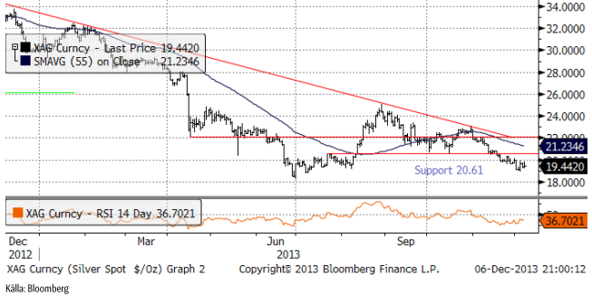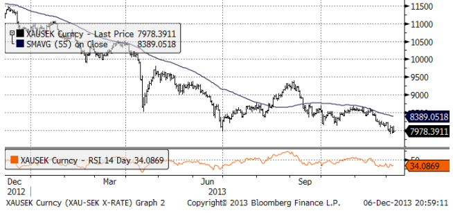 Guldpriset (i dollar), fortsatte ner i veckan som gick. Sentimentet att investera i metallen är kompakt negativt. Det blev inte bättre av att Non-Farm Payrolls i USA i fredags visade att tillväxten skapar jobb. Inköpschefsindex för november som kom tidigare i veckan visar att optimismen ökat ännu mer i USA. Det gör att förväntningarna om att FED ska inleda ”tapering” av QE ökat. Guldpriset är nu på väg ner mot den tekniska stödnivån 1200 dollar.