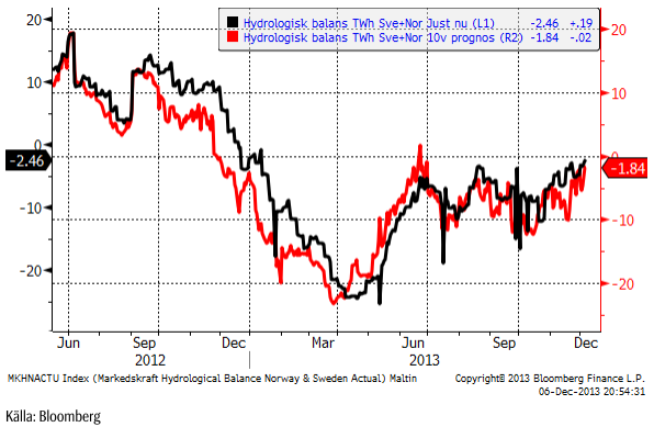 Det tidigare mycket stora hydrologiska underskottet har under höstens blidväder urholkats väsentligt. Som störst var underskottet 26 TWh, vilket är mycket signifikant. Nu återstår ett underskott på ungefär 12 TWh och med innevarande väderprognoser kan underskottet vara mer eller mindre utraderat en bit in i januari. Om så blir fallet är allt för tidigt att säga men kraftbalansen är nu mycket mindre ansträngd inför vintern.