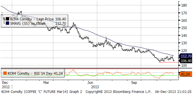Den genomsnittliga kostnaden för att producera ett pund arabica kaffe kommer enligt USDA att vara 147 cent under 2014. Ett långsiktigt jämviktspris bör ligga där, eller över den nivån. Ett pris på 106 cent är därmed inte långsiktigt hållbart. Marknaden tyngs dock fortfarande av den nya produktion som stimulerades av de högra priserna för tre år sedan och att länder vars odlingar drabbats eller slagits ut av bladmögelsvampen Roya, nu återigen kommer i produktion med resistenta sorter.