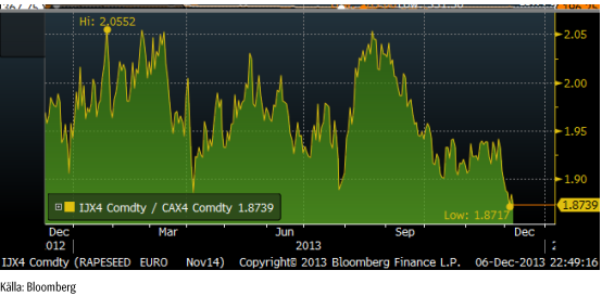 Nedan ser vi hur kvoten mellan novembers raps- och veteterminer utvecklat sig över tiden.