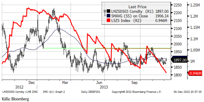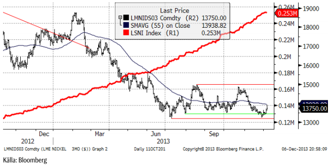 Samtidigt ser vi att COMEX-marknaden har en rekordhög kort position på spekulant-sidan (Non-commercials). De finansiella aktörerna fokuserar på FED och förestående ”tapering”. Commercials, spegelbilden av Non-commercials är alltså samtidigt rekordmycket köpta terminskontrakt. Man får förmoda att Commercials, som har verksamhet i den fysiska metallen, har bättre insyn i den fundamentala situationen i metallmarknaden. Men rapporter om ett kommande produktionsöverskott nästa år bidrar till ett negativt sentiment kring koppar. Å andra sidan kan efterfrågan på metall ta fart i början på nästa år efter att företagen minskat lagren inför årsskiftet. En stor nettosåld position hos Non-commercials, en vändning i det negativa sentimentet och påfyllning av företagens lager, kan få igång en hausse tidigt nästa år.