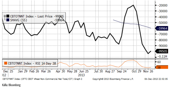 I diagrammet nedan ser vi ”non-commercials” nettoposition i terminer på Chicagovete. De passade på att köpa tillbaka några kontrakt, men är fortfarande extremt sålda vetekontrakt.