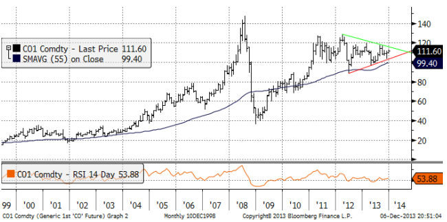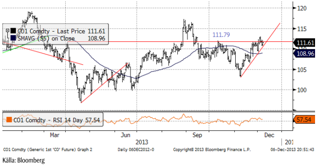 Oljepriset stängde i fredags på 111.6 dollar per fat. Priset ligger dikt an den tekniska stödnivån för uppgången den senaste månaden. Ett brott av stödlinjen är nästan helt säkert och när det sker kommer priset att rekylera ner till åtminstone 107 – 108 dollar per fat.
