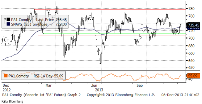 Priset på palladium uppvisar i sammanhanget en förbluffande styrka, genom att stiga i pris den senaste veckan. Det råder dock ett underskott av palladium och efterfrågan från bilindustrin väntas växa. Fundamentalt ser det annorlunda ut för palladium jämfört med t ex guld. Än så länge finns dock inte någon teknisk köpsignal att agera på. Priset ligger fortfarande inom det breda prisintervall mellan 640 och 780 dollar per uns som marknaden pendlat inom det senaste året.