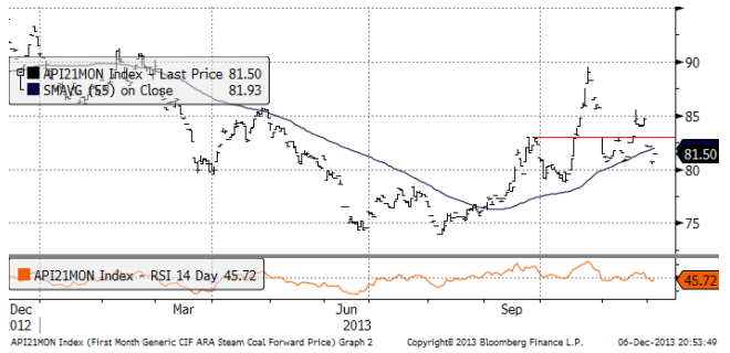 Nedan ser vi priset på energikol, den närmaste månadens leveranstermin. För två veckor sedan föll priset från 85 dollar per ton ner mot 80. För en vecka sedan stängde priset på 82.50 och i fredags lite lägre på 81.50. Det kan inte uteslutas att marknaden vill ner och testa 75 dollar igen. Råvarumarknaden är allmänt besviken på att den konjunkturuppgång i Kina, som väntades under sensommaren faktiskt har uteblivit.