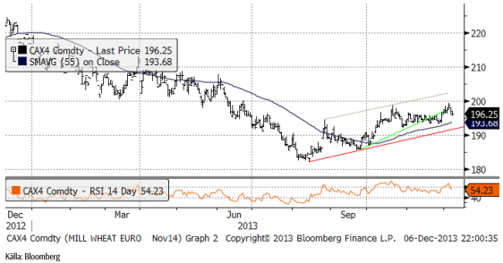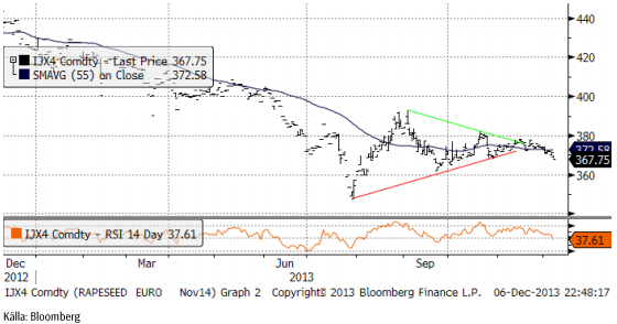 November 2014-kontraktet som legat i en tids stiltje, kom på fall efter Stats Canada-rapporten i onsdags. Tekniskt ser det ut som om prisfallet kan accelerera och nå ner mot 360 euro inom kort. Där bör det finnas stöd, men det kan inte heller uteslutas att priset faller ner till 350 euro per ton, basis november 2014-kontraktet.