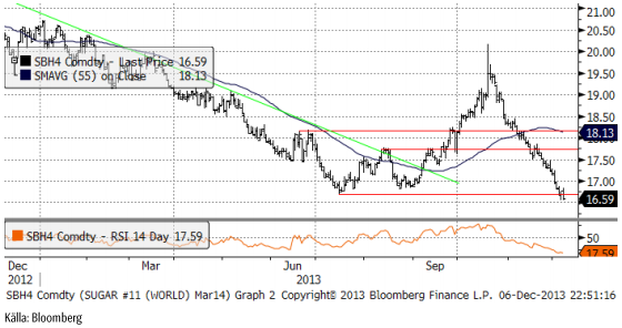 Marskontraktet på råsocker fortsatte falla och stängde veckan på den lägsta noteringen 16.59 cent per halvkilo. För en vecka sedan var priset 17.15 cent. Det är kontraktslägsta. RSI-index på 25 (<30) indikerar en översåld marknad och man kan vänta sig ett slut på prisfallet, följt av en rekyl uppåt.