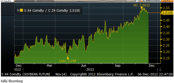 Nedan ser vi relationen mellan priset på Nov 2014 sojabönor och Dec 2014 majs, alltså priset på SX4 dividerat med priset på CZ4. Kvoten backade lite till i veckan, från rekordet 2.55 till förra veckans 2.52 till fredagens 2.51. Trots detta är det alltså mycket mer attraktivt att odla sojabönor än majs.