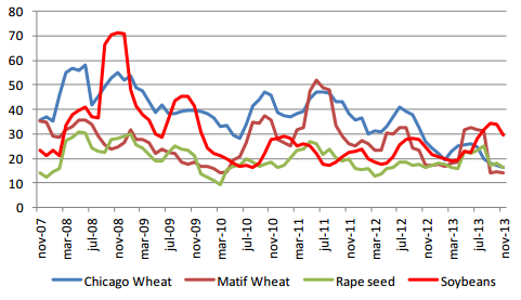 Sedan juli för två år sedan har kursrörligheten i vetepriserna minskat från ca 40% till ca 15% idag. Det är i nivå med hektarskördevariationen. Detta hänger naturligtvis ihop med växande lager och lägre priser. Säsongsmässigt är det även vinter på norra halvklotet och få nyheter som kan påverka utbud och efterfrågan. Vintern är å andra sidan säsongen för prisförändringar i sojamarknaden, eftersom Sydamerika har tagit över som den stora producenten i världen och känsligt för odlingsbetingelser där.