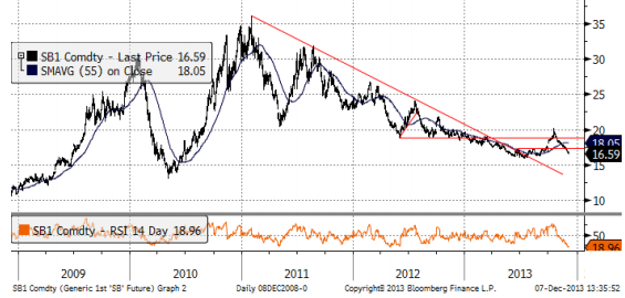 Tekniskt tyder allt på att marknaden inom kort kommer att vända uppåt. Vi förväntar oss att den prisuppgången når högre än den senaste, dvs att nästa rörelse uppåt når över 20 cent per pund.