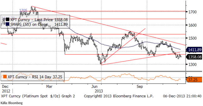 Tekniskt har platinapriset brutit en triangelformation på nedsidan, vilket signalerar en fallande trend. Enligt den teniska analysen skulle ett test av 1300 dollar vara att vänta.