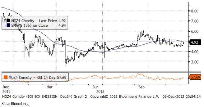 Utsläppsrätterna har å andra sidan stärkts den senaste veckan. Priset har brutit den nedåtgående trenden från september och kan möjligen gå upp och testa 6 euro per ton. Priset stängde i fredags på 4.92 euro. Först måste dock den psykologiskt viktiga nivån 5 euro brytas.