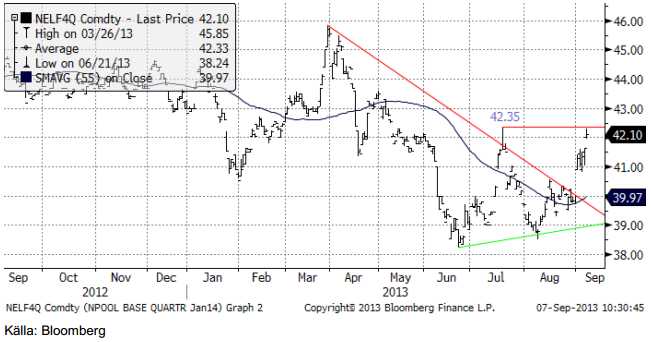 Nedan ser vi spotkontraktet på ”årskontraktet” för el, dvs vad det skulle kosta att prissäkra ett helt kalenderår. Just nu avser spotkontraktet priset för att prissäkra leverans av el under hela år 2014. Diagrammet är på dagsbasis. Även här ser vi att vi har en teknisk köpsignal, då trendlinjen bröts och prist gick förbi toppen i juli.