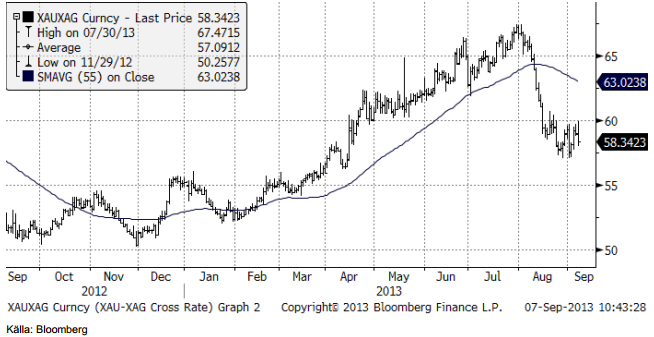 Nedan ser vi kvoten mellan guldpriset och silverpriset.