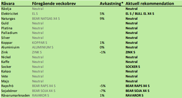 *) Avkastningen lämnar vi blank här eftersom det har varit ett två månaders uppehåll. Generellt sett har dock rekommendationerna varit lyckosamma med kraftiga nedgångar i priset på t ex spannmål och oljeväxter och prisuppgång på basmetaller.