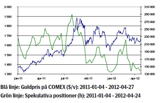 - Guldet steg 1,97 procent förra veckan och har för tillfället svårt att bryta ut på uppsidan. Flera länder går till val i Europa vilket försvårar för gemensamma förhandlingar. Tidigare överenskommelser såsom den förhandlade budgetpakten, som drivits fram av Tyskland, kan komma att rivas upp eller omförhandlas vilket försvagar euron och ger styrka till dollarn vilket i sin tur dämpar guldpriset.