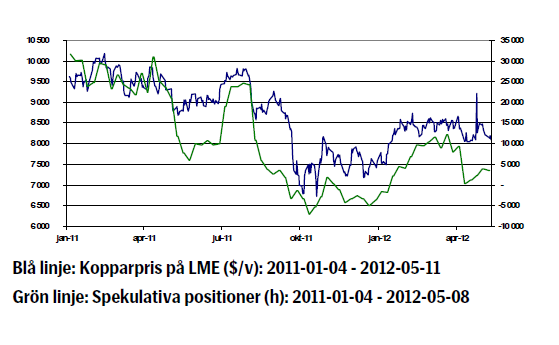 - Kina sänkte i lördags reservkraven för sina största banker med en halv procentenhet till 20 %. Detta var den tredje sänkningen på 6 månader. Denna stimulans väntas öka likviditeten i systemet och kan ge stöd åt kopparpriset. Kinesisk inflationstakt dämpades till 3.4 procent i april från 3.6 procent i mars. Pristrycket är lågt för närvarande och tillväxttakten låg under första kvartalet på den lägsta nivån sedan början av 2009. Kopparpriset föll med 0,8 procent veckan som gick och handlade kort under den viktiga 8000 dollar nivån.