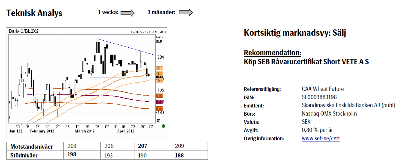- Till skillnad mot sin amerikanska motsvarighet gick vetet i Europa upp något under förra veckan. Detta till stor del baserat på USDA:s jordbruksrapport, i vilken man bedömer att framförallt produktionen i Europa kommer att vara svag under 2012. Det land som kommer att ha störst bortfall är Ukraina, där skörden väntas minska med över 40 procent jämfört med föregående skördeår. Den köldknäpp som drabbade Europa under början av 2012 har fått omfattande konsekvenser och priset på MATIF-vete har sedan årsskiftet gått upp med 1,5 procent. Under samma period har vetepriset i Chicago minskat med nästan 14 procent.
