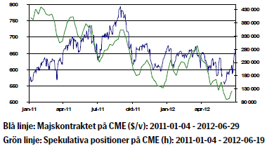 Amerikansk majs har handlats upp kraftigt p.g.a. av den allvarliga torka som råder i USA och majsen fortsätter att handla på höga nivåer. Bristen på fukt kan komma påverka kvalitén negativt. Majspriset steg 15 procent under veckan och det är en helt väderrelaterad prisökning.