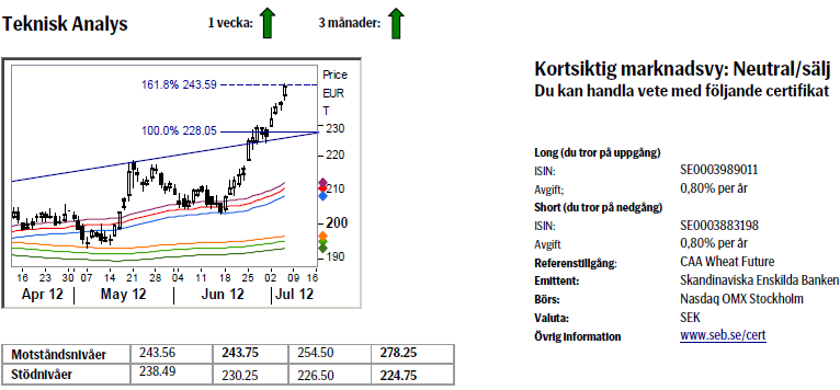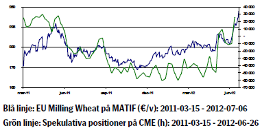 IGC (International Grains Council) skrev i sin senaste rapport att utsikterna för världens veteproduktion 2012/13 påverkas av ogynnsamma väderförhållanden i vissa länder, däribland Ryssland, och justerar därför ned sitt estimat av veteproduktion med sex miljoner ton från förra månaden till 665 miljoner ton. Det europeiska kvarnvetet på Matif (nov12) noterade i veckan ett nytt kontraktshögsta och handlades så högt som 235,75 euro innan det stängde på 232 euro. Vetehandlare tittar nu särskilt på rådande väderproblemen och utsikterna i USA. Under junimånad har vetepriset på CBOT stigit med 18 procent.