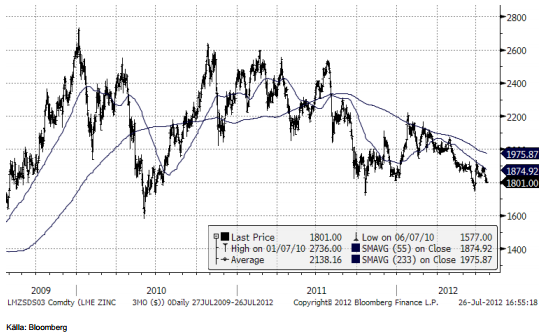 Zinkpriset ligger på bottennivåer i det prisintervall som etablerats sedan 2009. Produktionskostnaden för zink ligger på dessa nivåer. I råvarumarknaden brukar man kalla detta för råvarans ”fundamentala golv”. Vi ser därför inte några stora kursfallsrisker i zink.