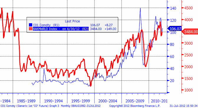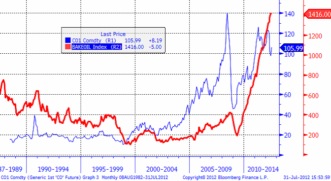 Nedan ser vi antalet borr-riggar i världen de senaste 30 åren enligt Baker Hughes Inc. Blå linje är priset på Brent.