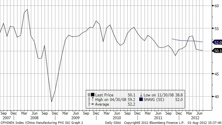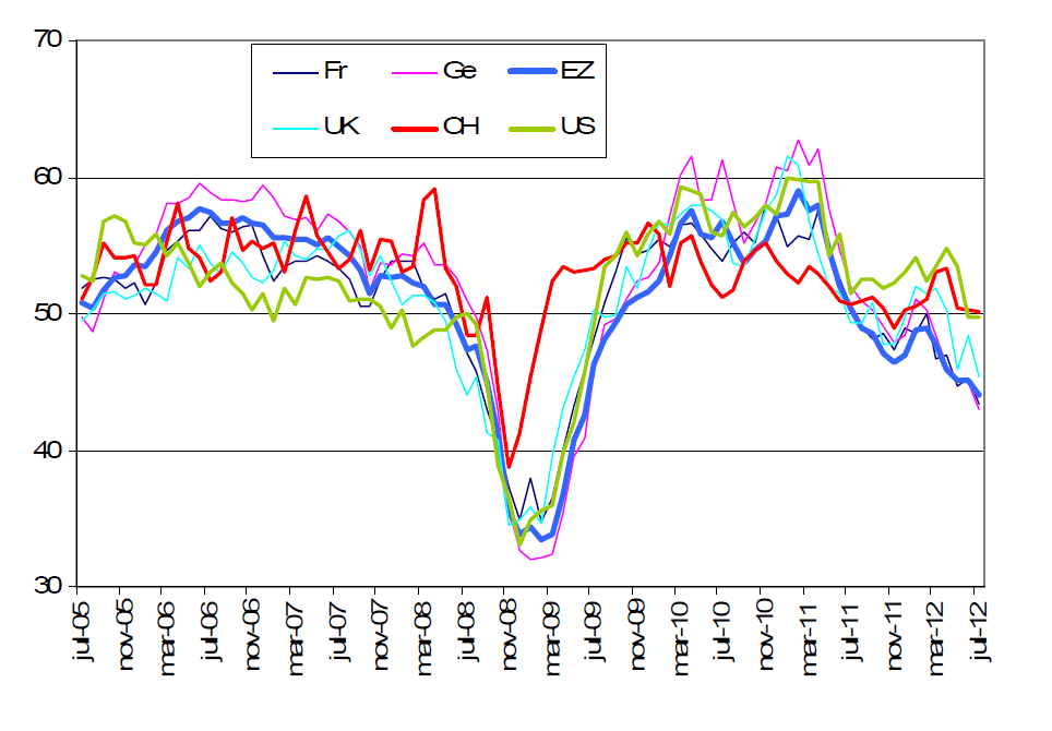 Inköpschefsindex, PMI, för de stora ekonomierna har sjunkit stadigt det senaste året. Tysklands PMI för tillverkningsindustrin ligger nu under Frankrikes, på 43 mot 43.4. Eurozonen ligger på 44. Storbritannien har bromsat in fort de senaste tre månaderna och har sjunkit från 50.2 i april till 45.4 i juli. USA har halkat under 50. Endast Kina ligger över 50. Gårdagens kinesiska PMI kom in på 50.1, vilket är en tiondel lägre än i juni (50.2). PMI anses vara en ”ledande indikator” för ekonomins utveckling.